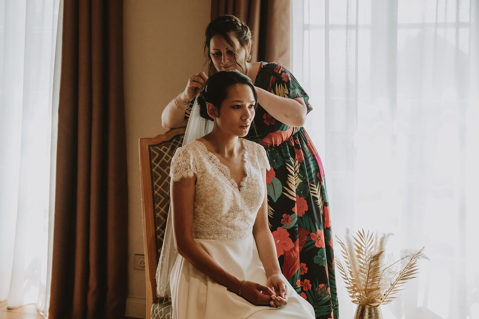 Rien ne transforme autant une photo que la lumière. Une fenêtre ouverte lors des préparatifs, un dîner en extérieur au coucher du soleil, ou même une cérémonie face à la lumière dorée de fin de journée : ces choix changent complètement l’ambiance.